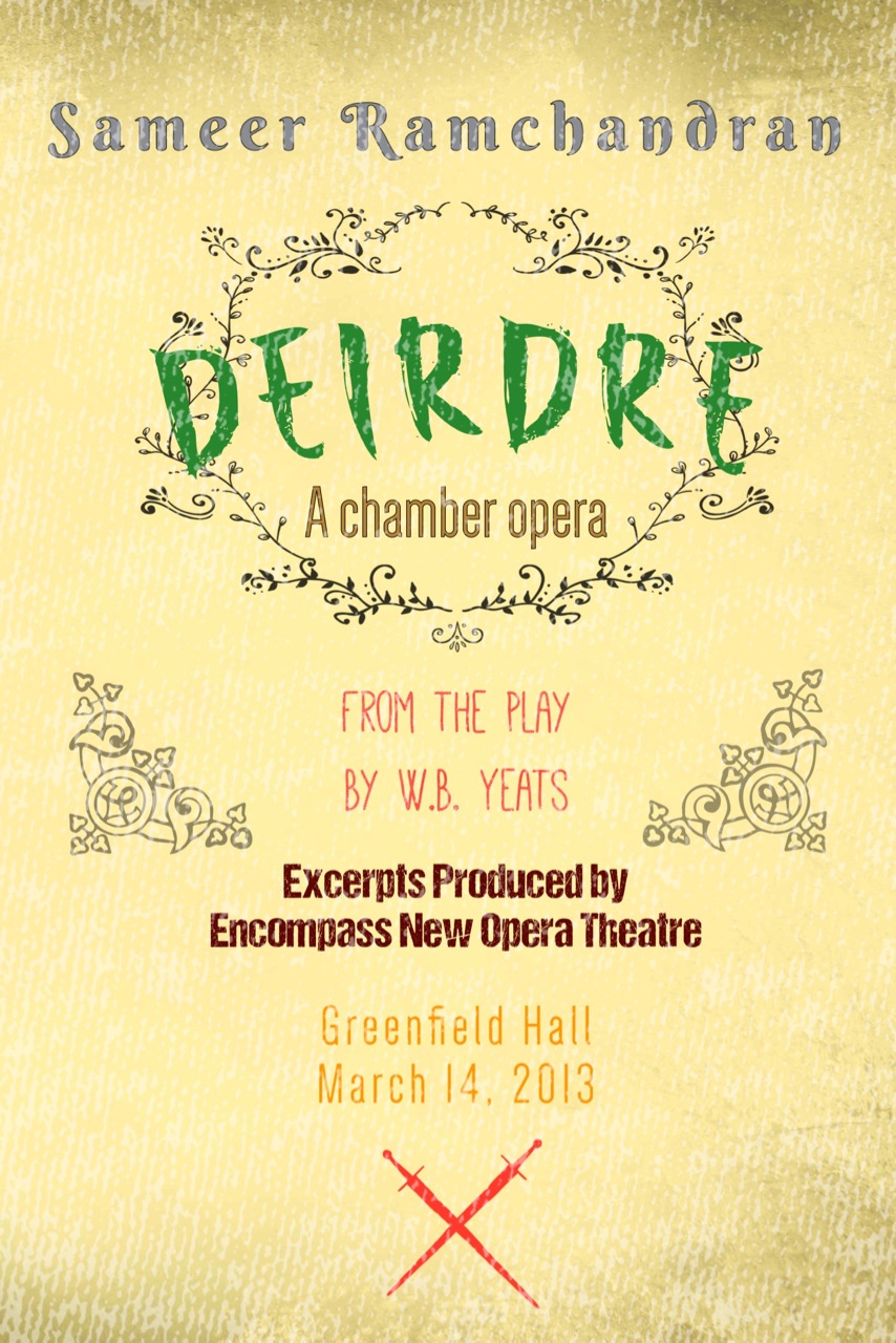Composer’s Note: I was attracted to the archaic nature of the story; I felt that there was a quality of mystery surrounding the time-period and setting. All the while, Yeats’ play was very much grounded in reality – the struggles and feelings of the characters seemed very real and present. I saw a dichotomy in these two elements, of mystery and reality, and I felt that I could construct a serious but enchanting piece of musical theater around them. The story had a thematic human element that was familiar enough to engage an audience on a basic level. The world of Deirdre seemed to be filled with danger, drama, beauty and magic. There is poetry in the language of the work, which is to be expected from Yeats, but there is also a lofty dignity that brings weight to the characters and the narrative. I felt that these characters spoke with an original and exciting voice.