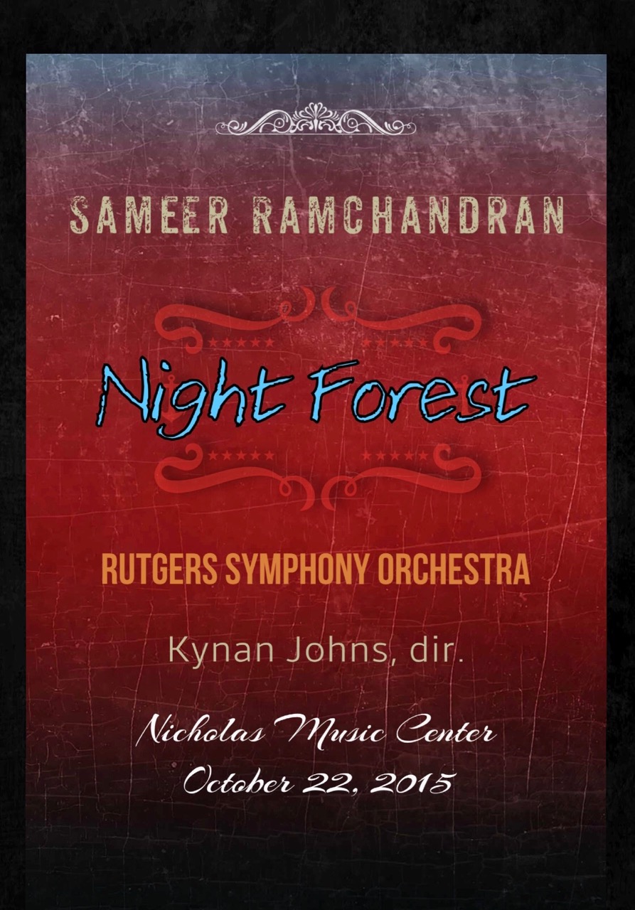 Program Note: Night Forest was inspired by the various European tone poems and works for dance written in the late nineteenth and early twentieth centuries. As a manner of tone poem itself, it tries to inspire notions of storytelling without telling a particular tale in itself. By referencing film music and opera in a broad, schematic sense, there is the hope that it projects various fervent, but ambiguous, feelings of narrative and adventure. The work is formed through three separate and connected sections, where each section built around various contrasting melodic ideas.